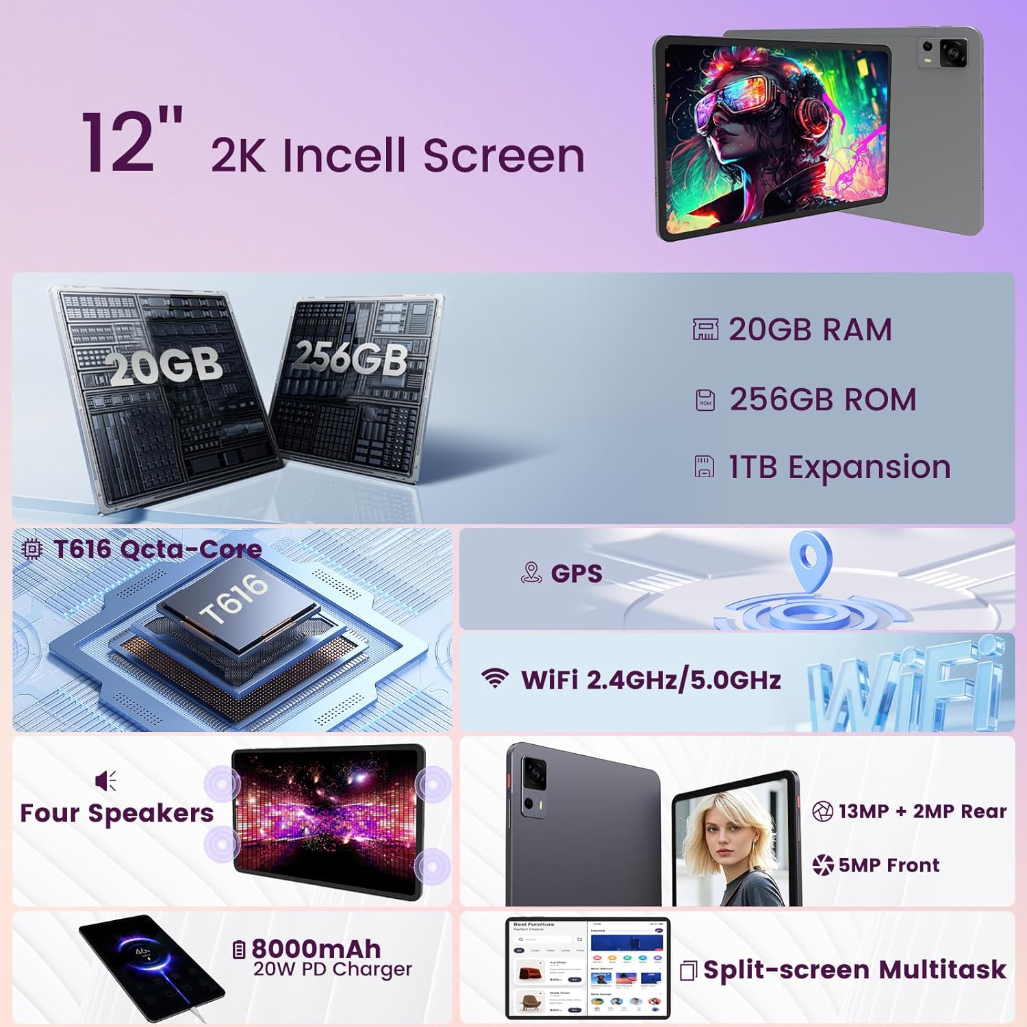 Android Tablet, 12 Inch Tablet with 2K IPS Display & Case, Octa-Core up to 2 GHz, 20GB RAM 256GB ROM 1TB Expand, 8000mAh, 20W Fast Charger, Dual-Band WiFi, Support GPS Face Unlock Widevine L1