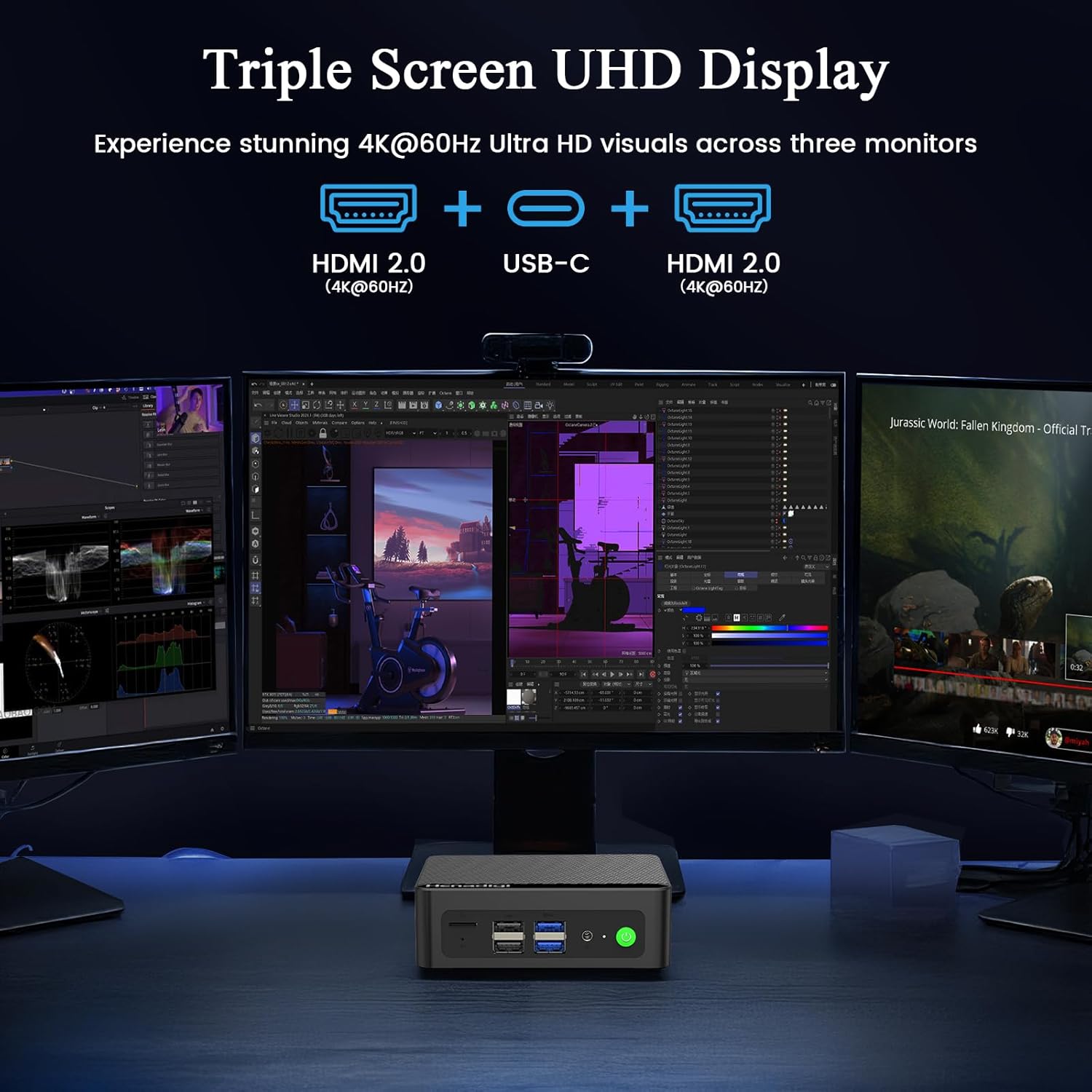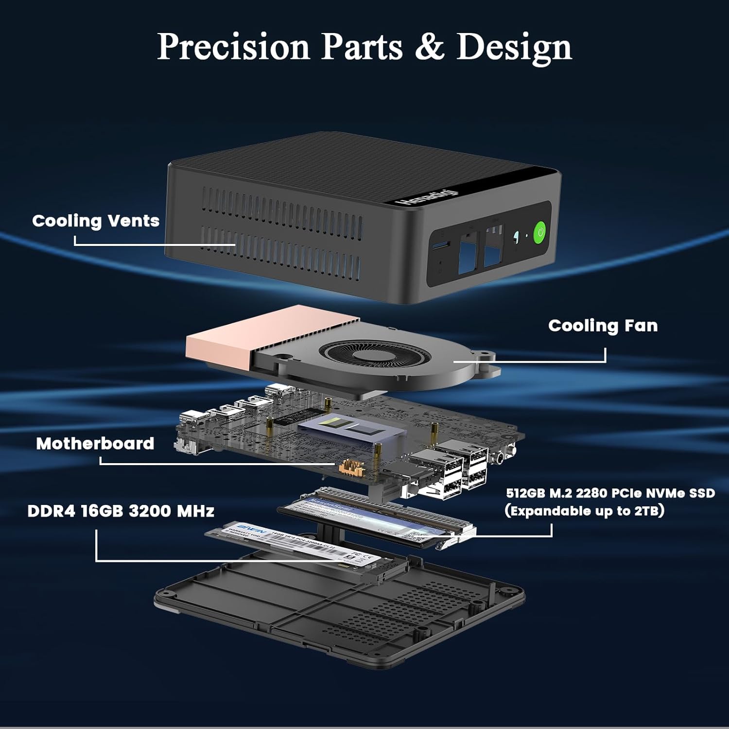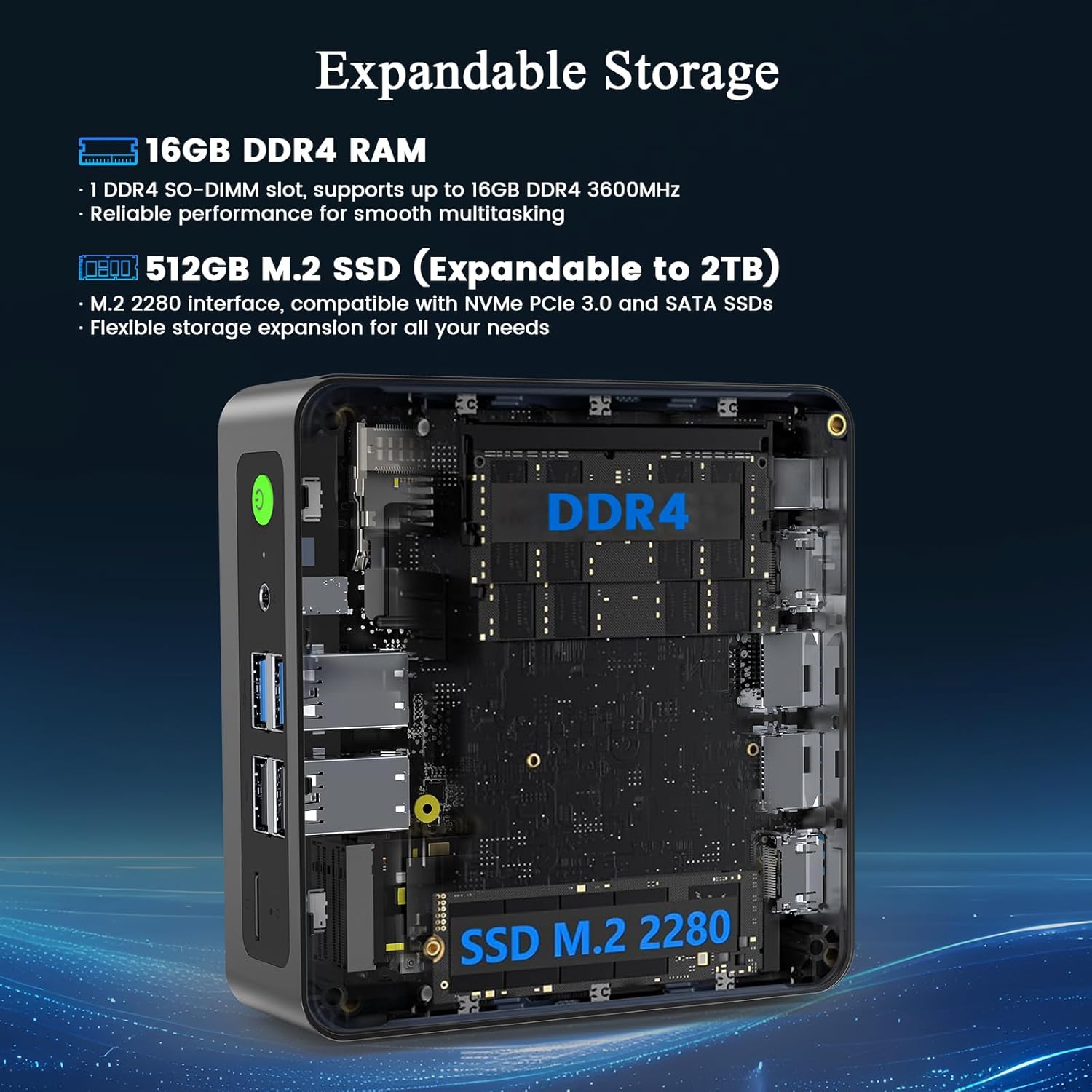 - 【Ample Storage & Smooth Multitasking】Pre-installed with 16GB DDR4 RAM and a 512GB M.2 PCIe NVMe SSD, this compact computer ensures fast boot-ups, quick app launches, and lag-free multitasking. Expand storage further with a 2TB SSD or a 512GB TF card—ideal for media libraries, work files, or gaming.(PS:The SSD/TF card is not including in the package)